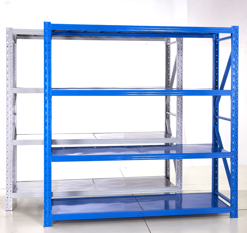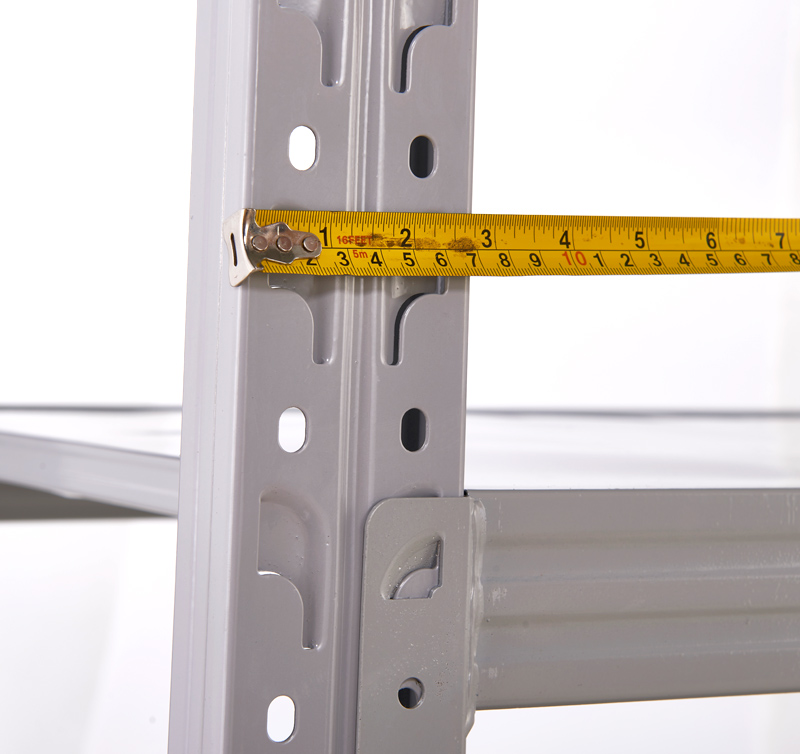 库房货架之间的间距可以打地脚固定,货架的层板之间空间可以自由调节,货架默认发货是4 层,可以根据货物需求是5层或者6层,因为立柱是每层由蝴蝶孔的设计,层数的高低可以自由调节,灵活性较好,组装也方便。